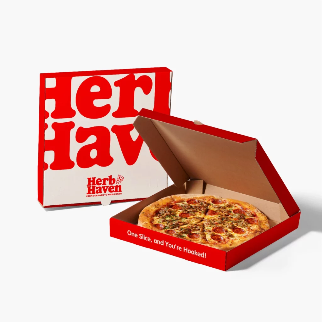 A classic necessity for pizzerias, personalized pizza boxes protect food while showcasing your brand. Consider designs like the pizza box with your logo and tagline to leave a lasting impression.